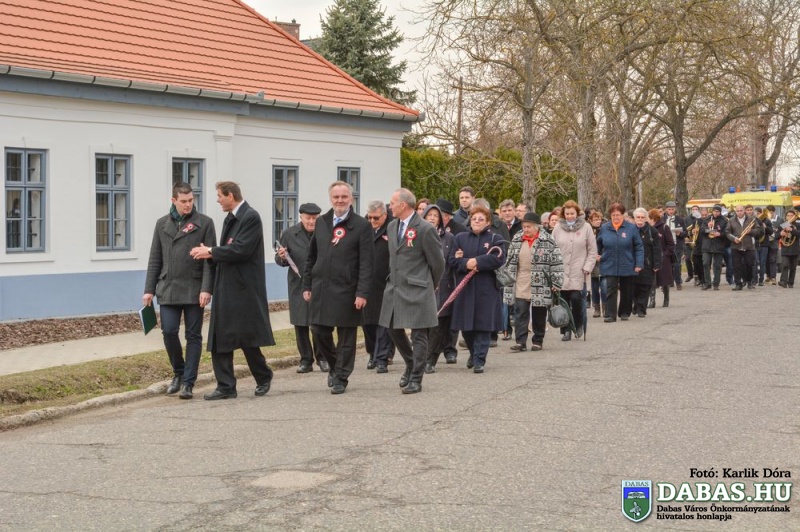 A rendezvény koszorúzással zárult, közel harminc intézmény, civilszervezet, egyesület kísérte a közös koszorút az épp 50 éve felavatott Kossuth-szobor talapzatához a Dabasi Kovács Sámuel Tüzércsapat felvezetésével.