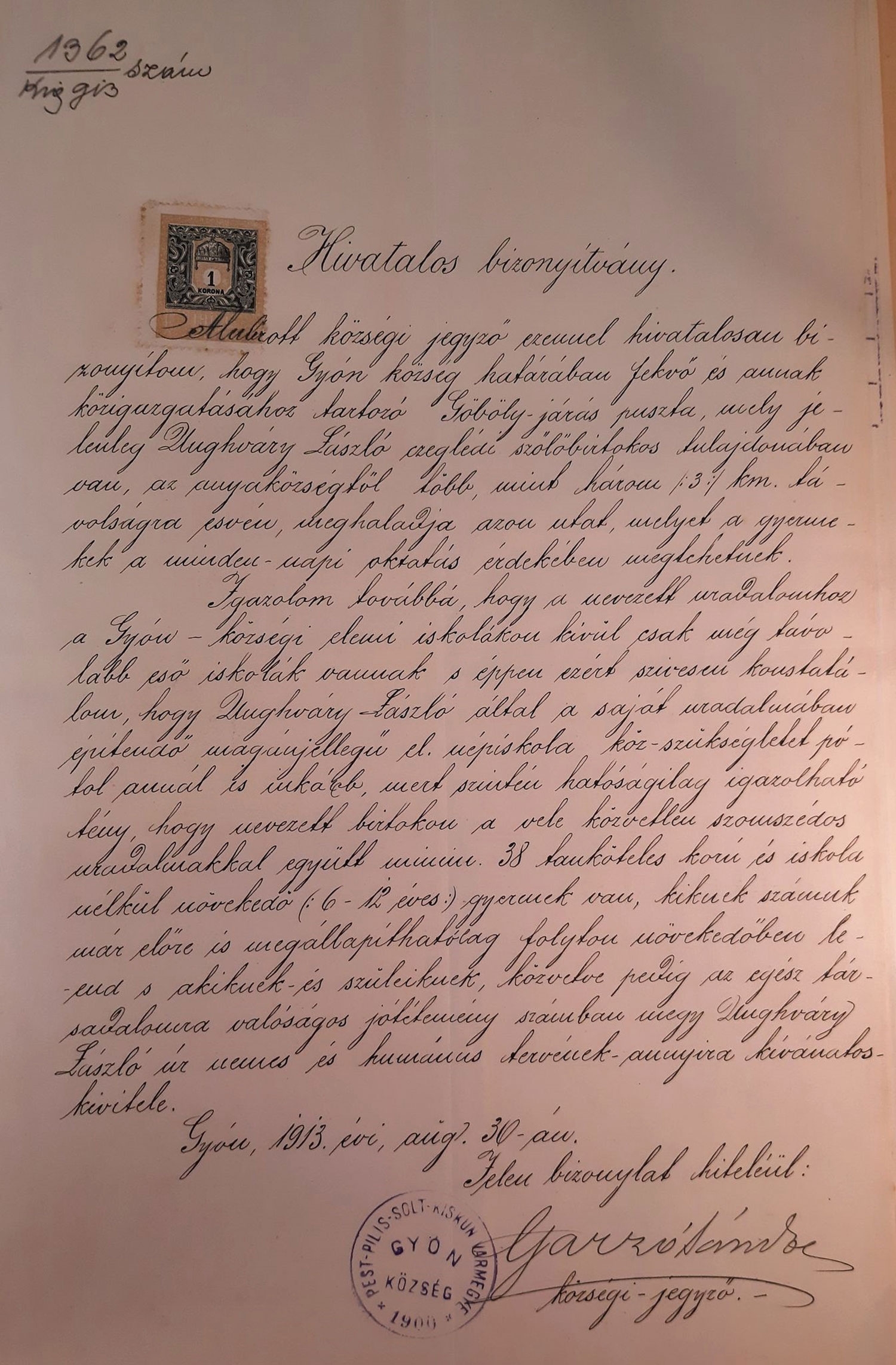 Alulírott községi jegyző ezennel hivatalosan bizonyítom, hogy Gyón község határában fekvő és annak közigazgatásához tartozó Göböly-járás puszta, mely jelenleg Unghváry László czeglédi szőlőbirtokos tulajdonában van, az anyaközségtől több, mint három /:3:/ km. távolságra esvén, meghaladja azon utat, melyet a gyermekek a minden-napi oktatás érdekében megtehetnek.