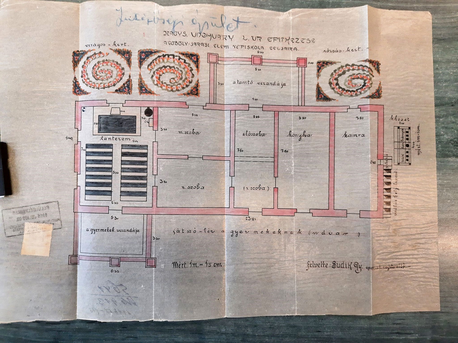 Igazolom továbbá, hogy a nevezett uradalomhoz a Gyón-községi elemi iskolákon kívül csak még távolabb eső iskolák vannak s éppen ezért szívesen konstatálom, hogy Unghváry László által a saját uradalmában építendő magánjellegű el. népiskola köz-szükségletet pótol annál is inkább, mert szintén hatóságilag igazolható tény, hogy nevezett birtokon a vele közvetlen szomszédos uradalmakkal együtt minim. 38 tanköteles korú és iskola nélkül növekedő (:6-12 éves:) gyermek van, kiknek számuk már előre is megállapíthatólag folyton növekedőben leend s akiknek- és szüleiknek, közvetve pedig az egész társadalomra valóságos jótétemény számban megy Unghváry László úr nemes és humánus tervének annyira kívánatos kivitele.